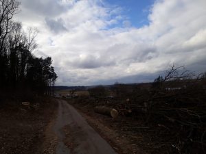 Endlich erreiche ich einen Waldweg, der Deckung verspricht. Zumindest war hier noch Wald, als ich das letzte Mal hier langgelaufen bin, was gar nicht so lange zurück liegt. Jüngst wurde hier offensichtlich gerodet und öffnet so den wenig reizvollen Blick auf die angrenzende Autobahn. Nicht zum ersten Mal frage ich mich, wie viel von den umliegenden Wäldern in den nächsten zehn Jahren noch existieren wird.