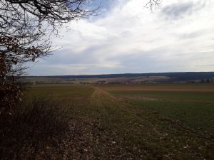 Ich lasse das, was vom Wald übrig ist hinter mir und laufe wieder gegen den Wind an. Wenige Kilometer später steht der erste von zwei Anstiegen an, nicht sonderlich lang, dafür extrem steil. Obwohl ich mich mental auf Gehen eingestellt habe, gelingt es mir, die Rampe im Laufschritt zu erklimmen. Ich werte das als positives Signal, heute bin ich gut drauf und mein Körper hat den langen Lauf von Samstag verdaut. Hier beginnt mein Heimweg und aus dem Gegenwind wird Rückenwind. Es folgt ein zweiter, steiler Anstieg und eine lange Talfahrt, hinab nach Schlüsselfeld. Dort wartet die letzte markante Rampe auf mich, auch diese gelingt im Laufschritt, der Rest des Weges führt mich über gut ausgebaute Feldwege mit leicht welligem Profil. Alles im Allen ein eher einfacherer Lauf heute, muss auch mal sein.