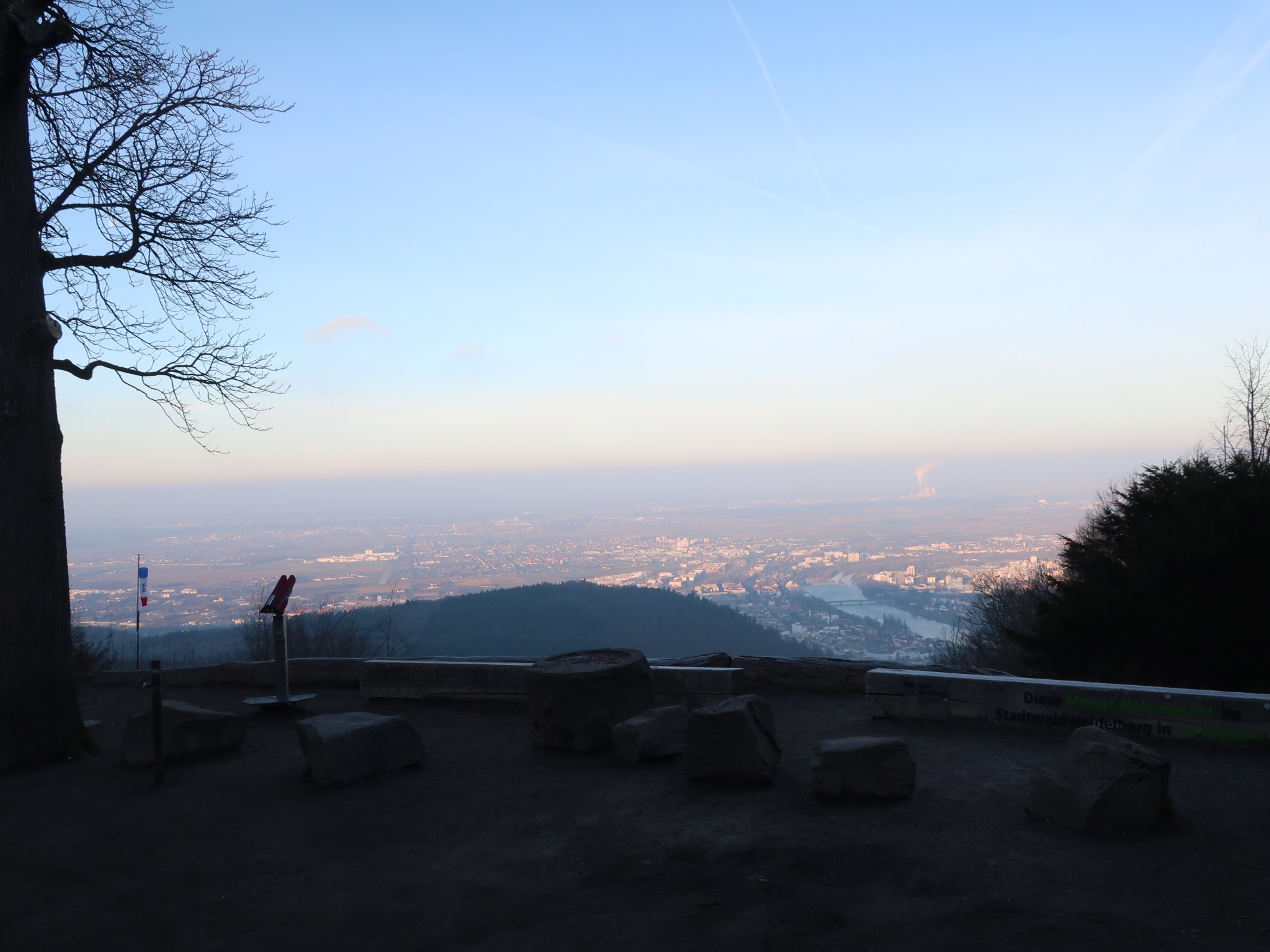 Nach einigen kehren Stoßen wir erneut auf eine Straße, der wir diesmal für ein paar Minuten folgen, eh es auf dem nächsten Trail weiter bergab geht. Zwischen den Bäumen können wir immer wieder die Lichter von Heidelberg sehen, es ist nun nicht mehr weit.