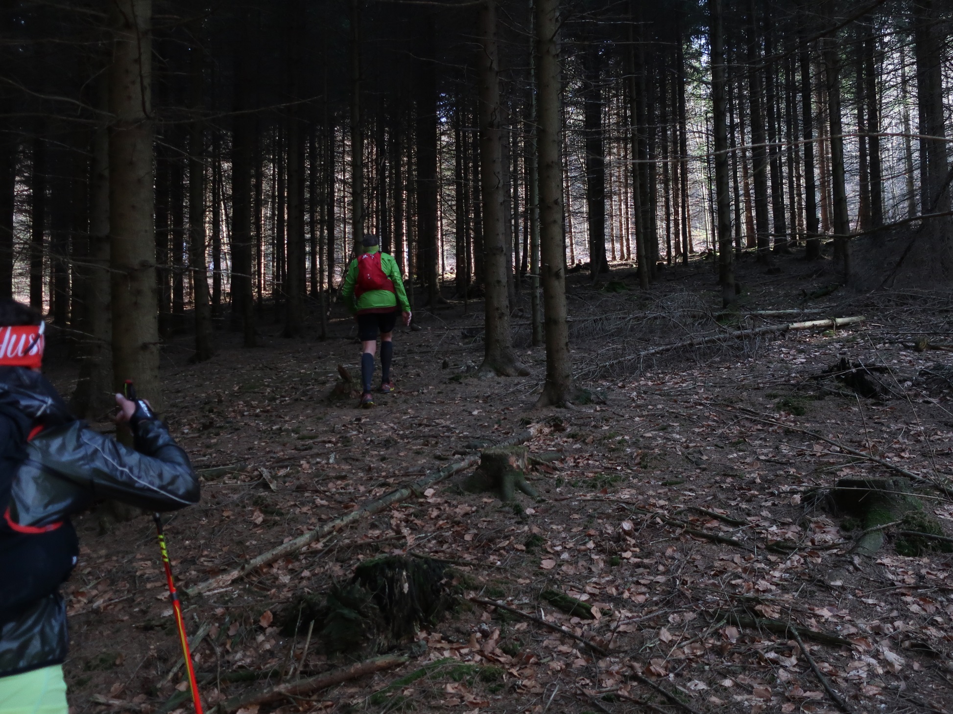 Der ebene Abschnitt hält nicht lange an, dann biegen wir in einen schmalen, aufgewühlten Weg ein, kein echter Trail, eher ein schlechter Forstweg. Erneut geht es aufwärts, ein Stück laufe ich noch, wechsel aber dann, wie alle vor mir, in schnelles marschieren. Nicht zum ersten Mal macht sich heute mein Training bezahlt: In den letzten Wochen habe ich mehrmals lange Strecken (50km+) in Marschtempo zurückgelegt. Ich kann ein paar Plätze gut machen.