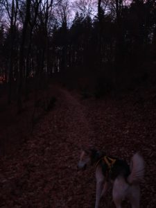 Unvermittelt treten wir aus dem Wald und stehen am Rand einer Ortschaft. Nach nahezu durchgängigem Trail ein kleiner Kulturschock. Eh wir die Ortschaft betreten, legen wir nun eine kleine Rast ein. Haferriegel für uns, Wasser und Leckerchen für die Hunde. Inzwischen hat die Dämmerung eingesetzt, in absehbarer Zeit werden wir die Stirnlampen brauchen. Die Temperaturen sind noch immer angenehm.